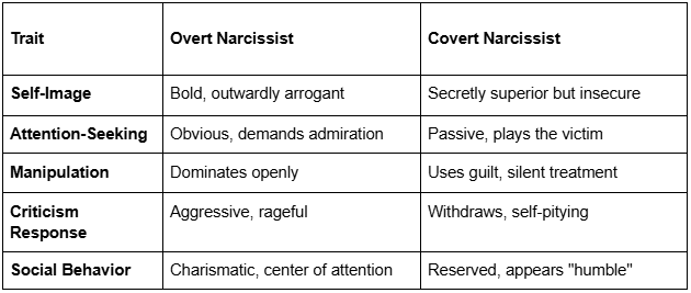 Overt narcissists are loud, boastful, and openly demand admiration. They believe they are superior and act accordingly. Covert narcissists seem shy or self-deprecating but harbor deep resentment and entitlement. They manipulate through pity, guilt, and subtle put-downs.